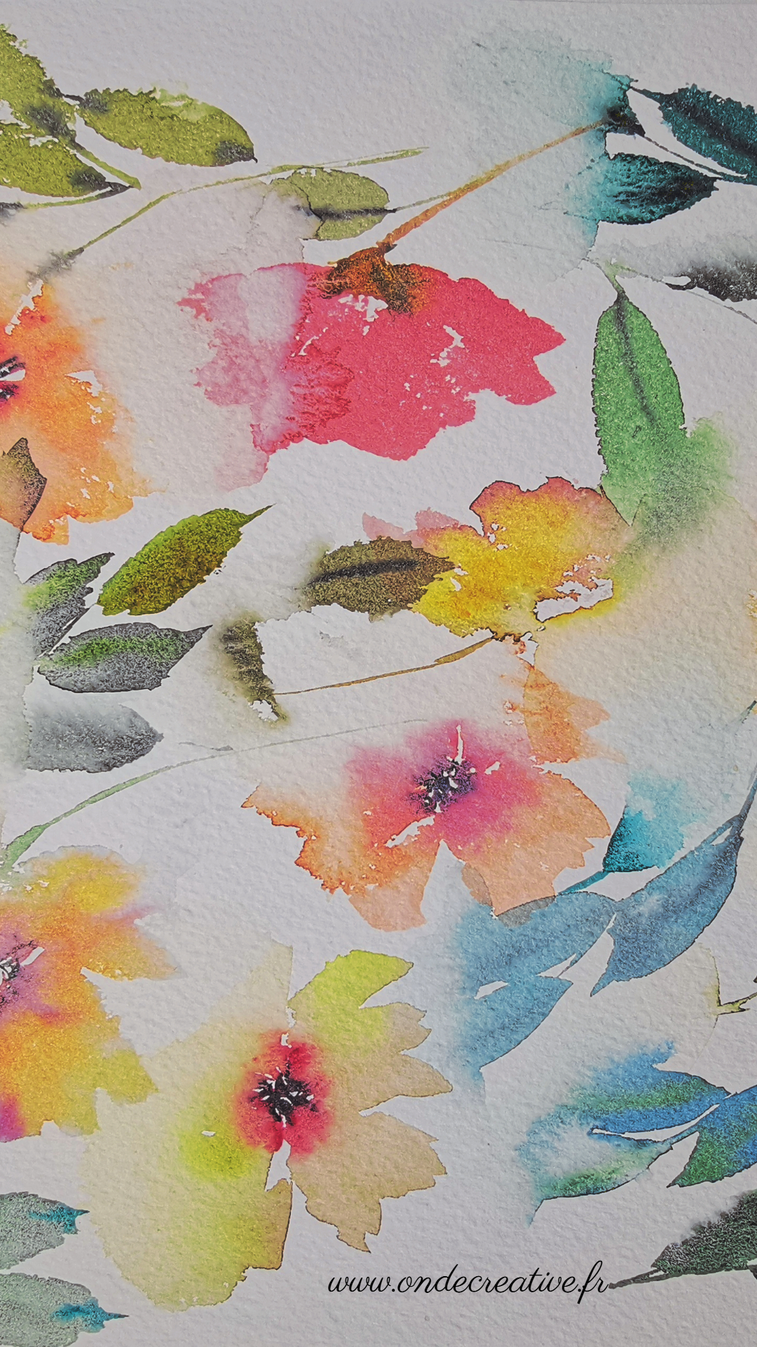 Ici j'ai utilisé une toile de coton 40x40, peinture acrylique Amsterdam et encres acrylique Sennelier Abstract. Et beaucoup d'eau… Souvent l'eau mène elle-même le processus. Un bel exemple d'impermanence qui nous entraine vers une finalité "structurée".